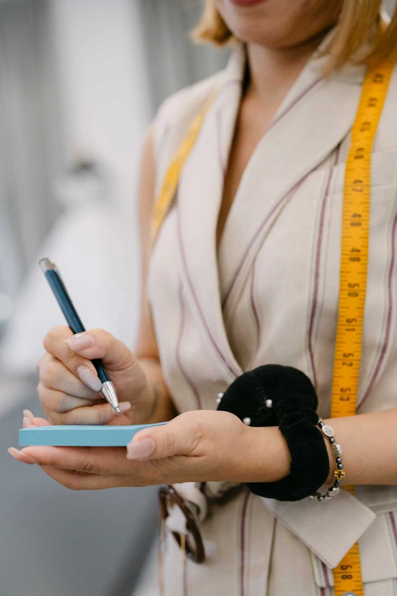 A woman is holding a blue notepad and taking notes with a pen. She has a yellow measuring tape draped around her neck, and is wearing a beige and red-striped shirt. She also has a black scrunchie with white pearls on her wrist and a bracelet with charms.