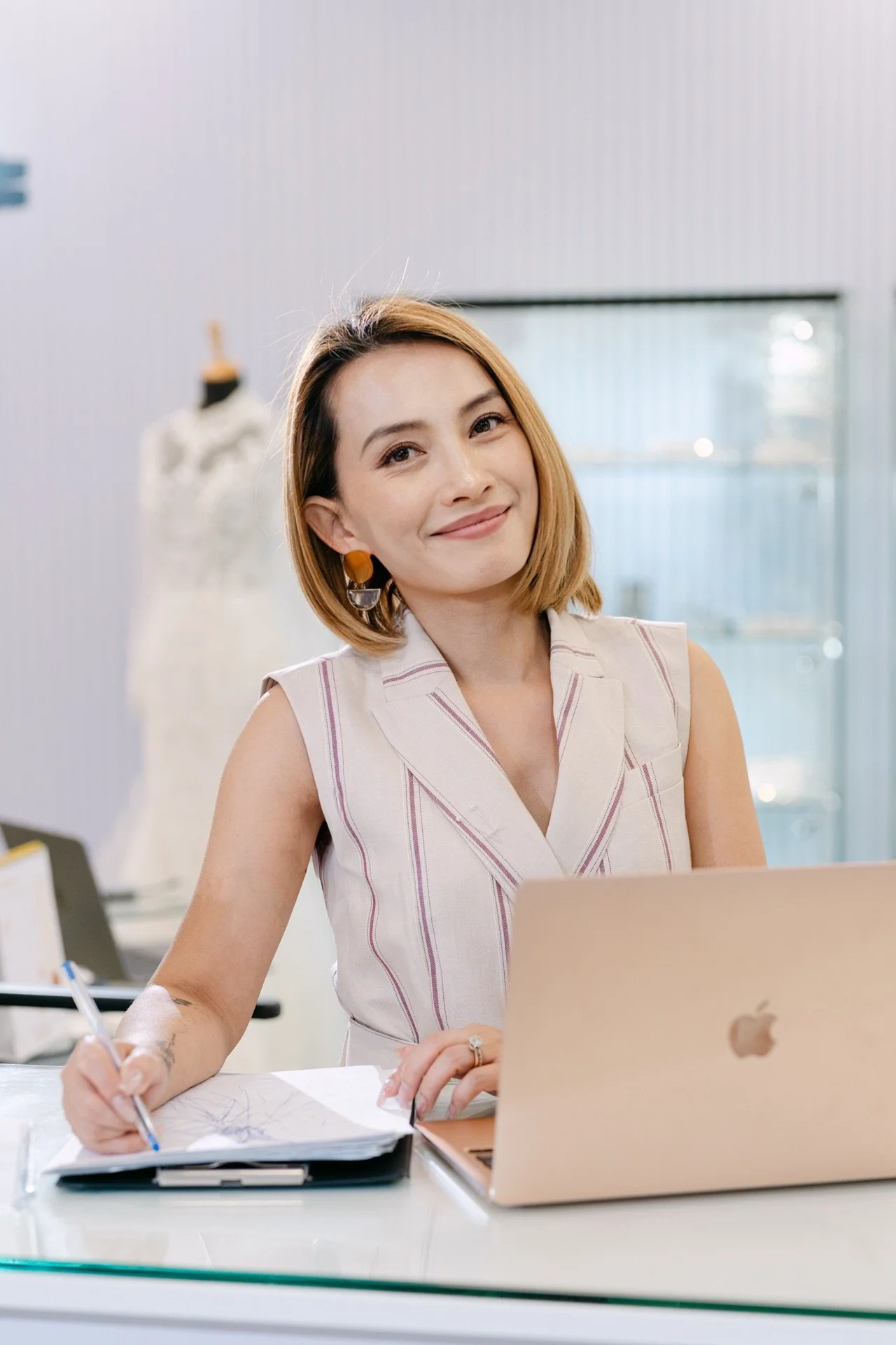 Smiling woman working with a laptop and notebook in a bright room with a wedding dress in the background.