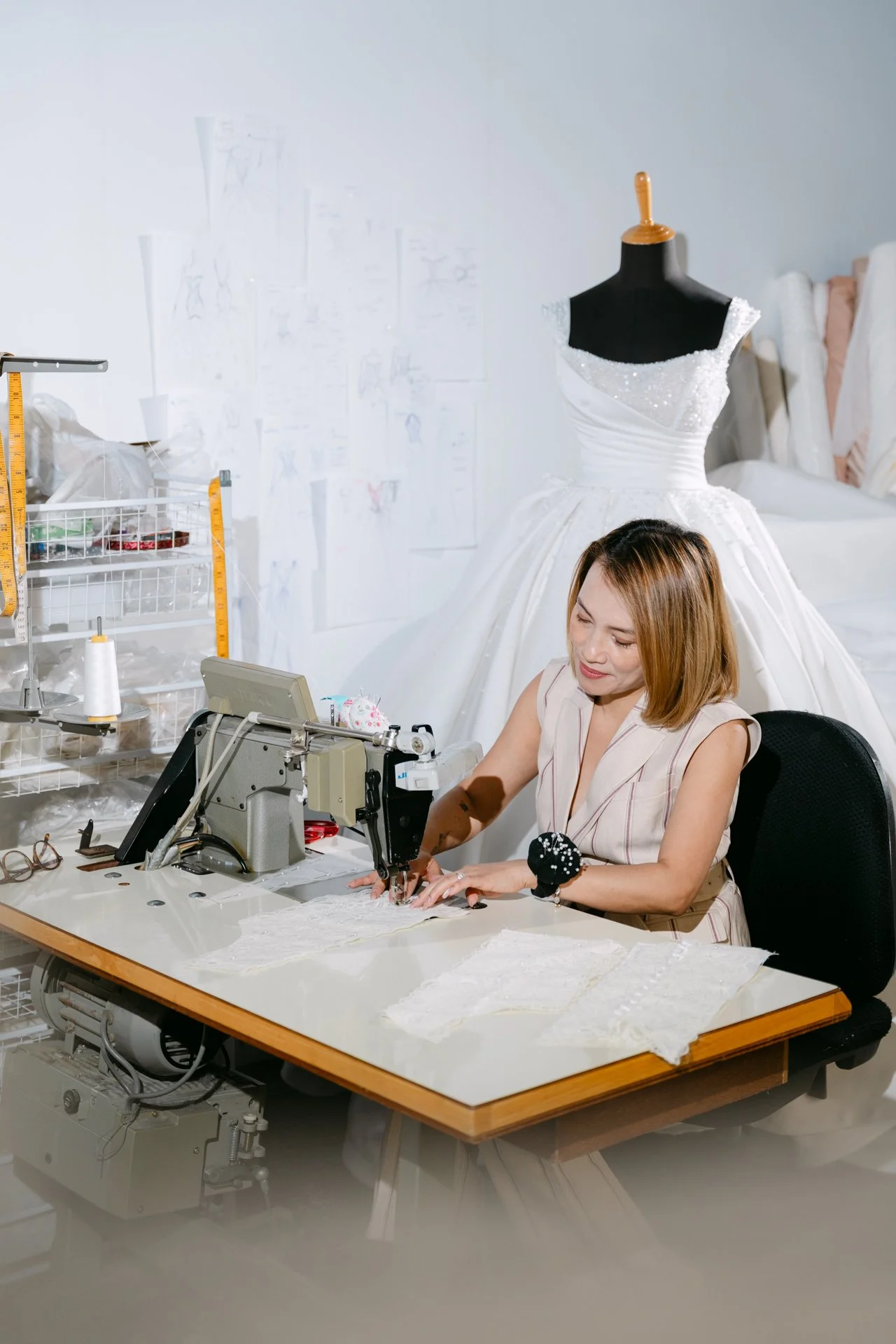 A woman sewing fabric in a dressmaking studio with a wedding dress on a mannequin behind her.