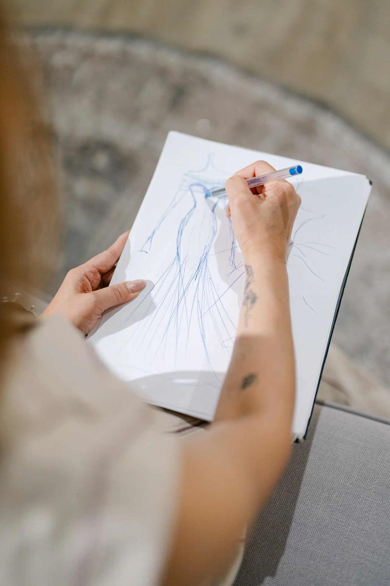 Person drawing fashion sketches of a dress on a white sheet of paper with a blue pen, showing an outline of a glamorous gown with flowing lines.